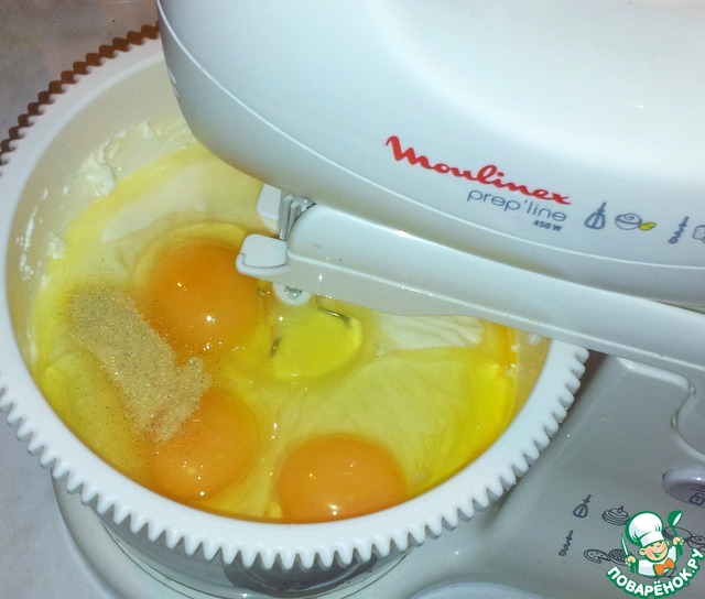 В маскарпоне разбила 4 яйца, добавила сахар, ванилин и соль.