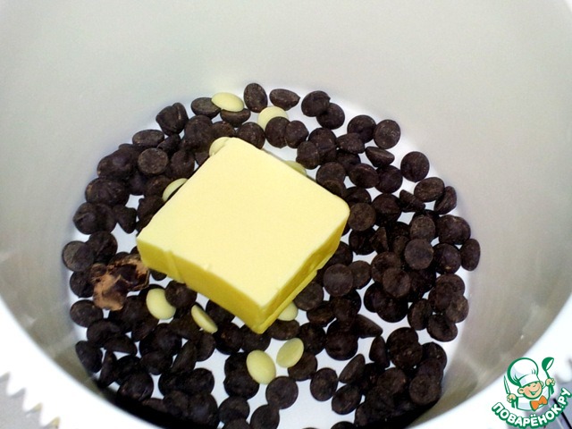 Для основания ( брауни ) - шоколад и сливочное масло растопила в микроволновке.