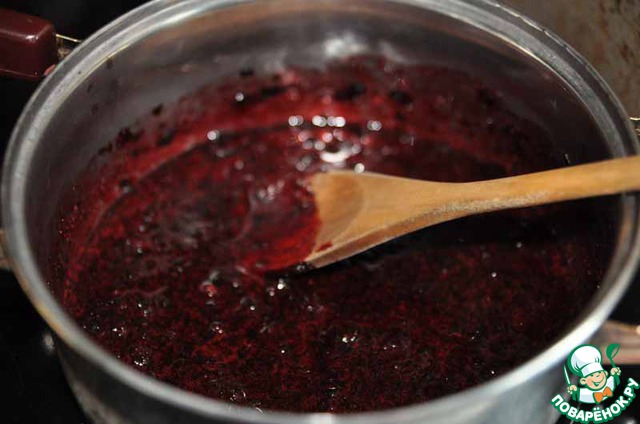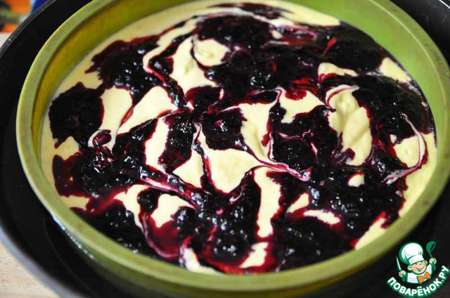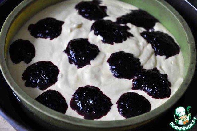 Сверху ложкой кляксами наносим сваренную с сахаром жимолость.