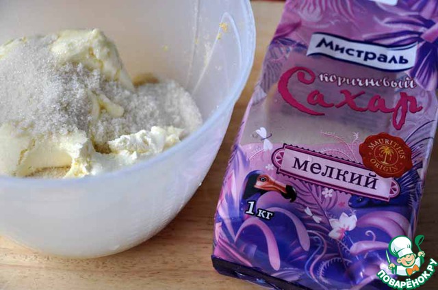 Берём маскарпоне (можно брать любой другой творожный сыр), добавляем сахар коричневый мелкий от "Мистраль" и взбиваем миксером до растворения сахара.