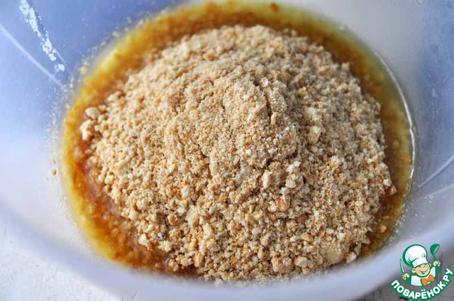 Смешиваем растопленное масло и крошку из печенья.