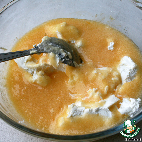 Теперь творог, снова растираем. У меня был обычный, магазинный в пачке - на нем значится вес 230 грамм (раньше по 250 делали, эх...). Если творог домашний, то его необходимо перетереть через сито или разбить блендером.