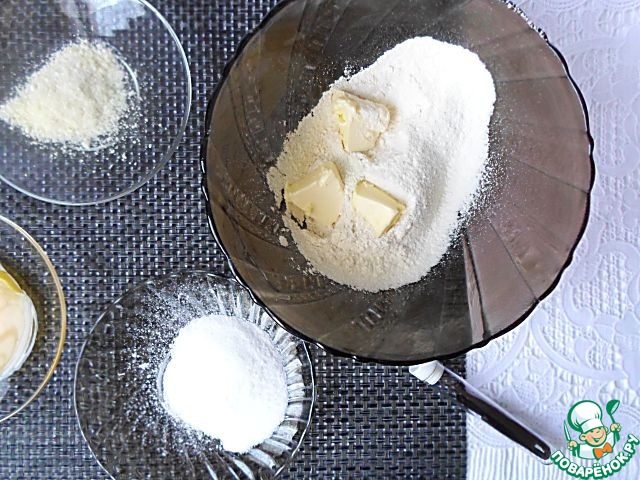 Разрезаем вдоль половину стручка ванили, выскабливаем с внутренней стороны семена. Добавляем семена к масляно-мучной крошке.