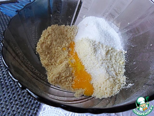 Добавляем сахарную пудру, миндальную муку, желток и соль, замешиваем тесто. Оно должно получиться гладким и эластичным.