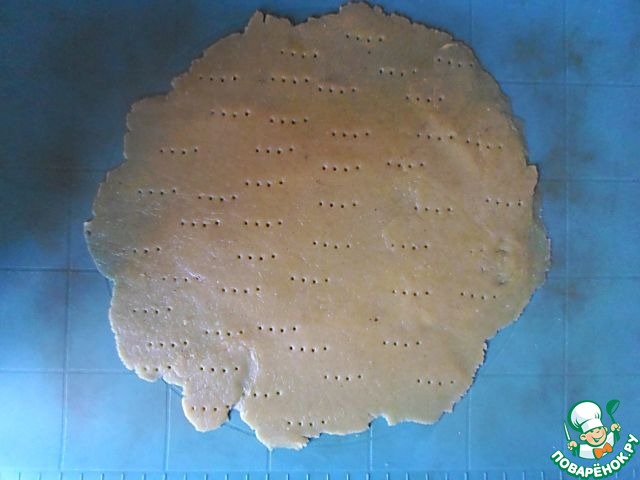 По прошествии часа раскатываем тесто в тонкий пласт 1-2 мм толщиной, часто накалываем вилкой, чтобы он не деформировался во время выпечки, выпекаем его на силиконовом коврике или пекарской бумаге 8 минут при температуре 180 градусов Цельсия до приятного золотистого цвета. Вынимаем из духовки готовый корж, но духовку не выключаем, ставим разогреваться до 240 градусов Цельсия.