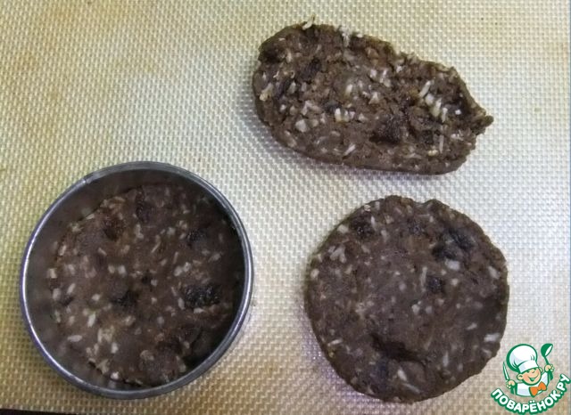 Смешать печенье, чернослив, яйца, размягченное сливочное масло, кокосовую стружку и замесить довольно крутое тесто.