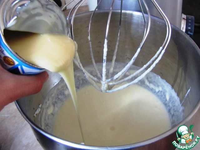 Затем добавляем яйца, ванилин, сгущенку и концентрированное молоко.