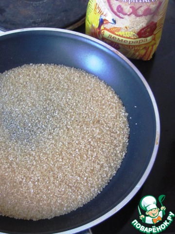 В кастрюльке или на сковородке растапливаем сахар, пока он не станет карамельного цвета. Осторожно, не перегрейте.
