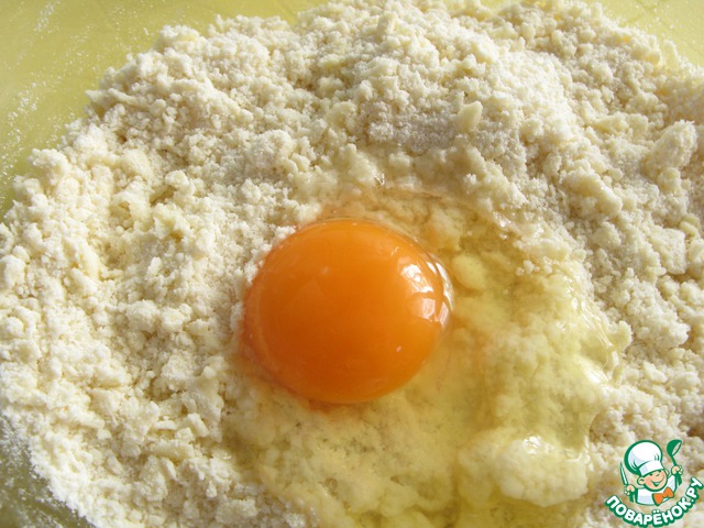 1. Муку, сахар (50г) и щепотку соли растереть в крошку с охлажденным сливочным маслом (80г).