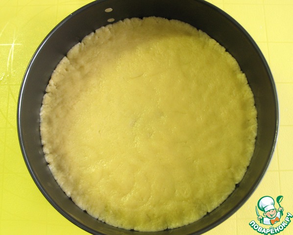 3. Тесто раскатать и выложить его в разъемную форму (d=22см), формируя основу для нашего чизкейка. Убираем тесто в холодильник на 30 минут, затем кладем сверху на тесто груз (фасоль или специальные керамические шарики) и выпекаем в разогретой до 200 градусов духовке, в течение 15 минут. Полностью остужаем.