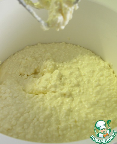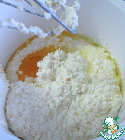 Творог растереть с сахаром (100г), ванильным сахаром, по одному вмешать яйца.