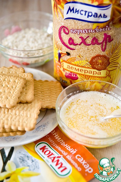 Смешать измельченные крекеры, овсяные хлопья, растопленное сливочное масло, коричневый и ванильный сахар.