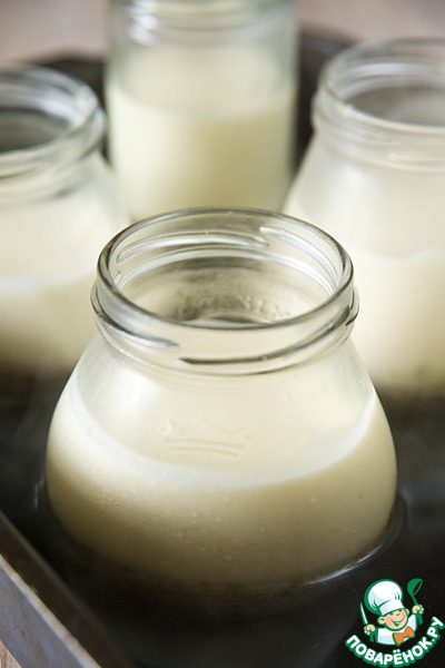 Баночки поместить в глубокий противень с кипящей водой и отправить в разогретую до 170°С духовку. Выпекать 25 минут, пока края не схватятся, а серединка будет еще подрагивать. Остудить до комнатной температуры и поставить в холодильник минимум на 4 часа.
