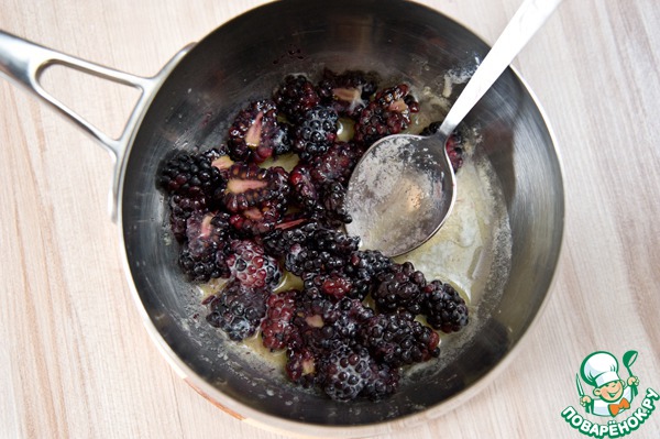 В сотейнике растопить 2 ст. л. сливочного масла. Добавить половинки ежевики, лимонный сок и сахар. Оставить вариться около 5 минут.