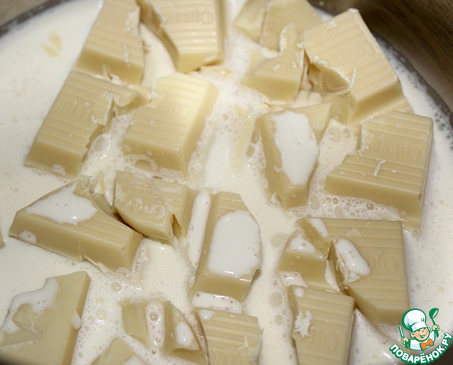 В кастрюльке растопить шоколад и 250 мл сливок.