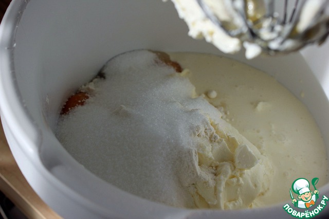Миксером взбить на маленькой скорости яйца с сахаром, кремчизом.