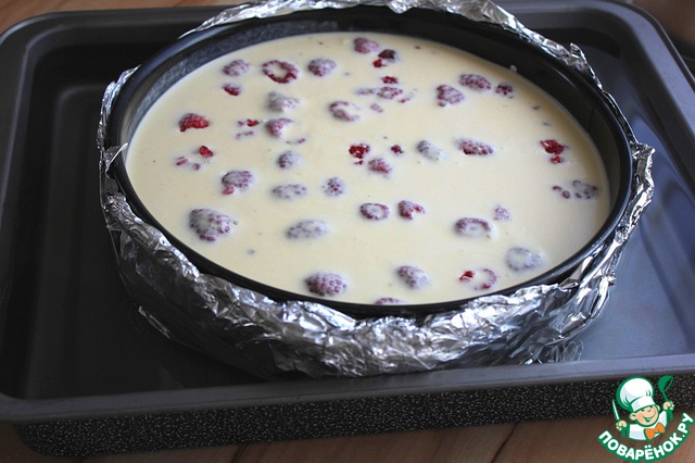 В форму вылить творожную массу, сверху положить малину. Немного постучать формой по столу, чтоб вышли пузырьки воздуха.