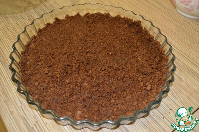 Растапливаем какао-масло. Печенье размалываем в блендере до состояния крошки. Смешиваем масло и размолотое печенье до однородного состояния. Выкладываем эту массу в форму. Если вы берете разъемную форму, то оберните ее фольгой, чтобы в последующем вода не просочилась внутрь. При помощи стакана хорошо придавите массу. Разогрейте духовку до 170 градусов и поставьте на 10 минут форму с печеньем. Достаньте и остудите.