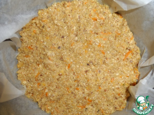 Застилаем форму пергаментной бумагой, чтобы готовый чизкейк было удобно извлекать из неё. Выкладываем основу, плотно утрамбовывая, особенно по краям. И на 15 минут в разогретую духовку до 180 градусов.