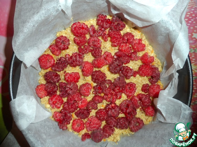 На остывшую основу выкладываем ягоды, у меня малина, немножко их вминаем. Отправляем в холодильник.