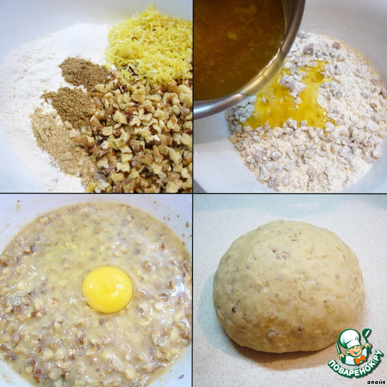 Грецкие орехи порубила ножом, смешала с мукой, разрыхлителем, специями и лимонной цедрой. Медовую массу добавила к ореховой и все тщательно перемешала. Добавила яйцо и, постепенно добавляя муку, замесила тесто. Тесто убрала в холодильник на сутки.