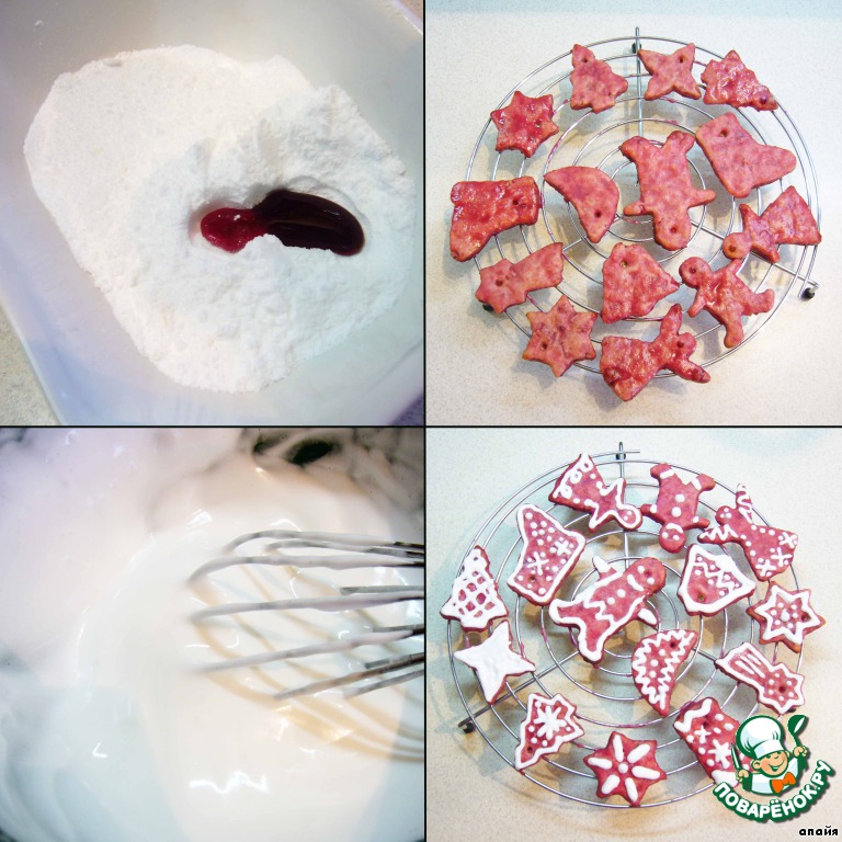 Розовый цвет делается очень легко. Я смешала сахарную пудру со свекольным соком и при помощи кисточки нанесла глазурь на пряники со всех сторон. Затем взбила белок с сахарной пудрой в пышную пену и при помощи кондитерского шприца нанесла узоры на пряники.