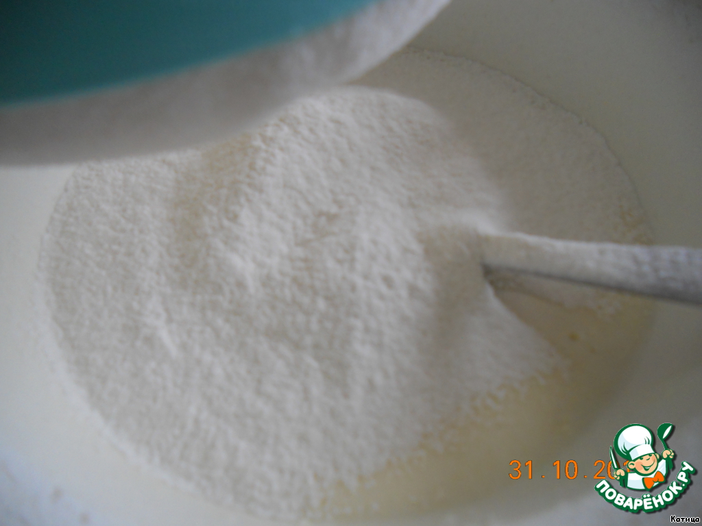 Муку с содой просеять и добавить в смесь, замесить тесто