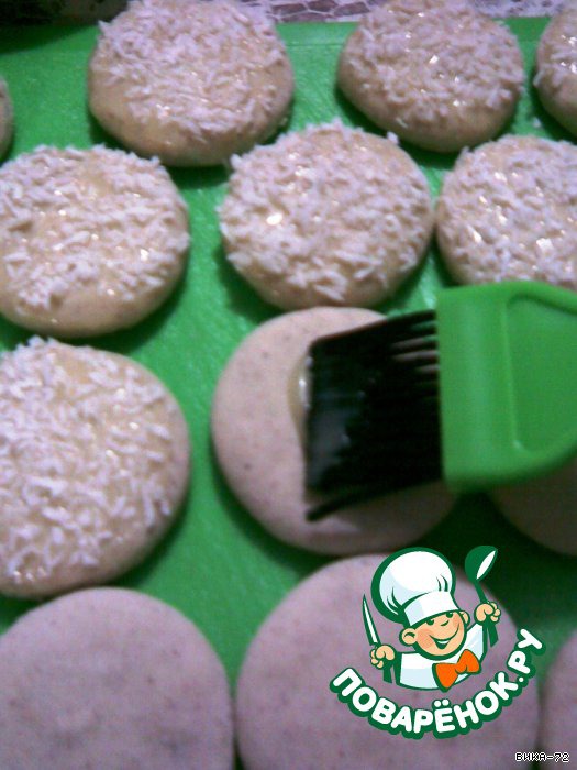 На остывшие кружочки кисточкой нанести белую глазурь и посыпать белой кокосовой стружкой