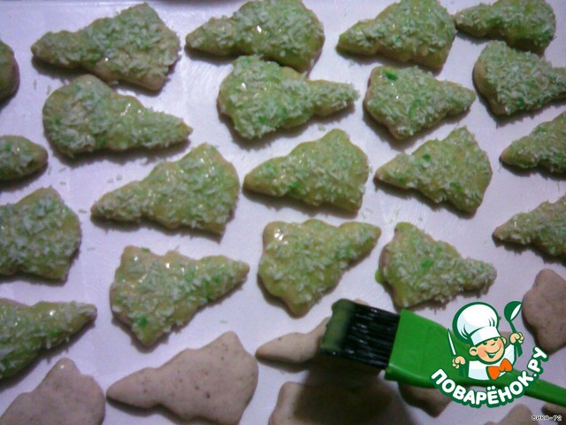 На елочки нанести зеленую глазурь и посыпать зеленой кокосовой стружкой