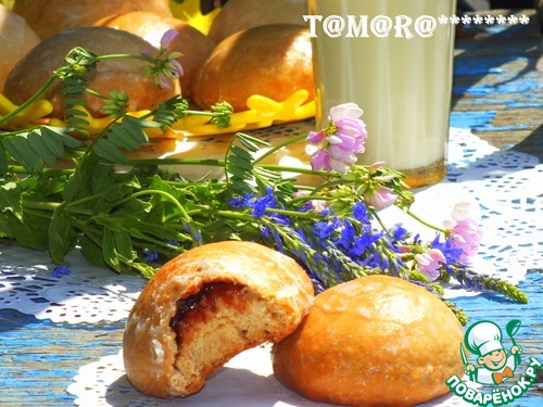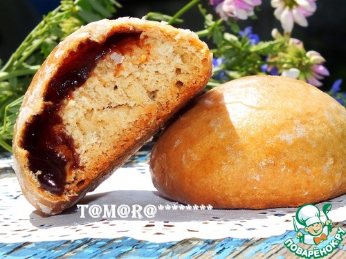 Замесить тесто оставшейся мукой. Тесто будет немного липнуть к рукам. На подпыленном мукой столе тесто разделить на порционные колобки. Колобок раскатать скалкой (тонко раскатывать не нужно), в центр выложить 1 ч. л. сливово-шоколадной пасты (или начинку по вашему вкусу).