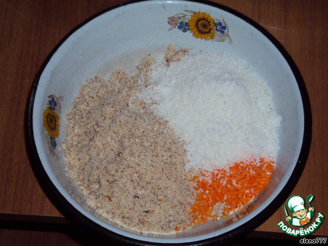 Миндаль перемолоть в кофемолке и соединить с кокосовой стружкой, крахмалом, ванилином и разрыхлителем. Белой кокосовой стружки мне не хватило и я добавила пакетик оранжевой.