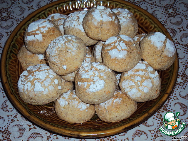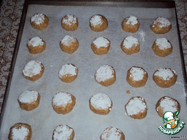 Скатать из теста шарики руками, смазанными растительным маслом. Каждый шарик одной стороной обмакнуть в сахарную пудру. Выложить на смазанный противень и поставить в разогретую духовку.