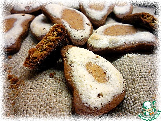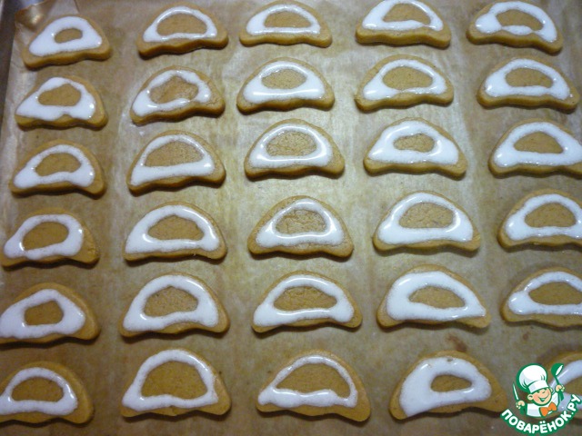 Остудить пряники. Срезать кончик кондитерского мешка и нанести на них рисунок взбитыми белками.