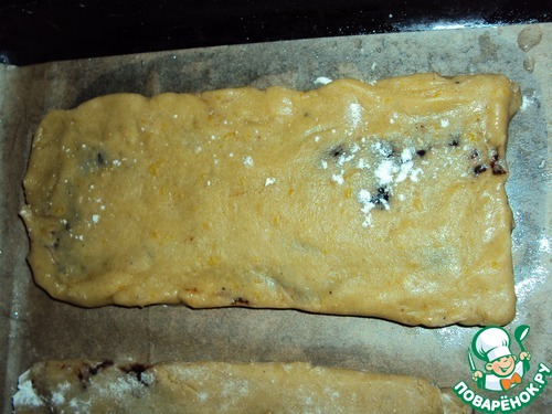 Подсыпать муку при необходимости. Противень застелить пекарской бумагой, смазать растительным маслом. Перенести 1-ый раскатанный прямоугольник (выбранная мною форма). Выложить начинку, сверху положить еще один раскатанный прямоугольник.