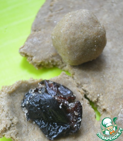 Раскатать тесто в пласт, стаканом вырезать кружочки. Выложить начинку, сформировать шарики.