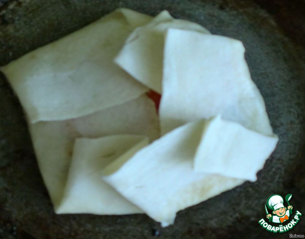 Туда же аккуратно разбить яйцо, края лаваша подвернуть к центру, обжарить до золотистой корочки.