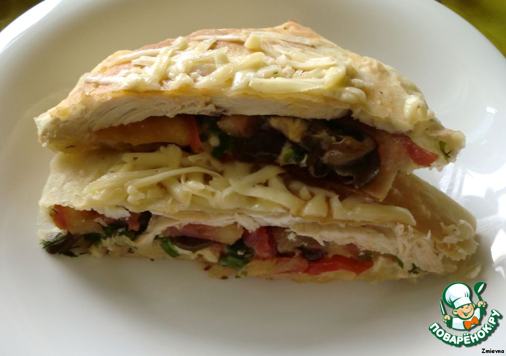 На сковороду с разогретым растительным маслом положить небольшой круглый лаваш, на него слоями выложить ломтики курицы, кружочки помидора, грибы, зелень, сыр,