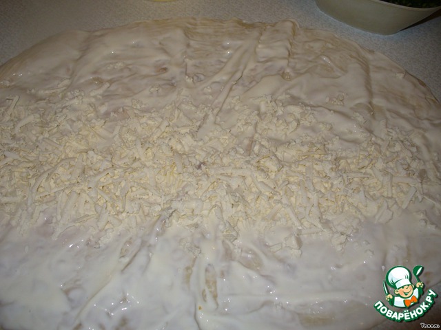 3. Натереть на тeрке треть брынзы, распределяя по длине листа лаваша. Если брынза очень солeная, можно добавить мелко нарезаный помидор.