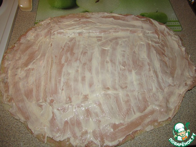 Сверху смазываем сметаной - 1 ст. л. (в оригинале нужно было полить в виде сеточки, у меня сметана была густая, поэтому сеточкой не получилось).