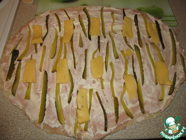 Затем выкладываем порезанные соломкой огурцы и пластинки сыра.