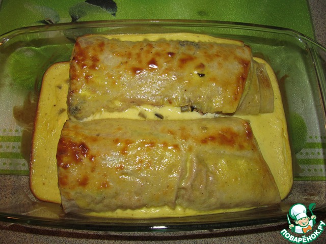 Сворачиваем рулетом и кладем в форму. Сворачиваем аккуратно, чтобы не порвать лаваш. Заливаем рулет оставшейся сметаной, взбитой с яйцом, посоленной и поперченной.