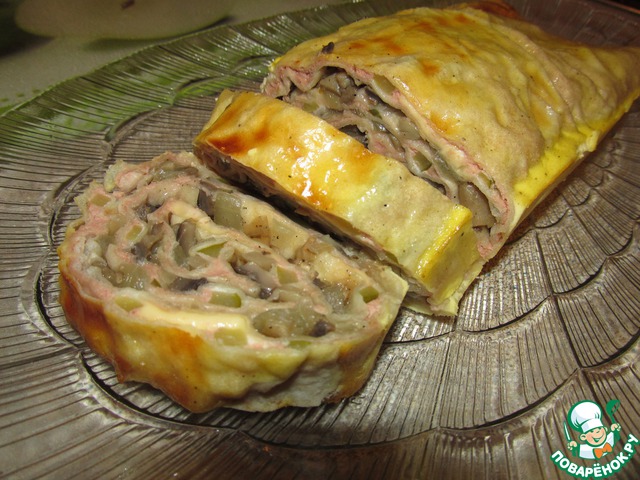 На второй лист выкладываем обжаренные с луком грибы, нарезанные кубиками.