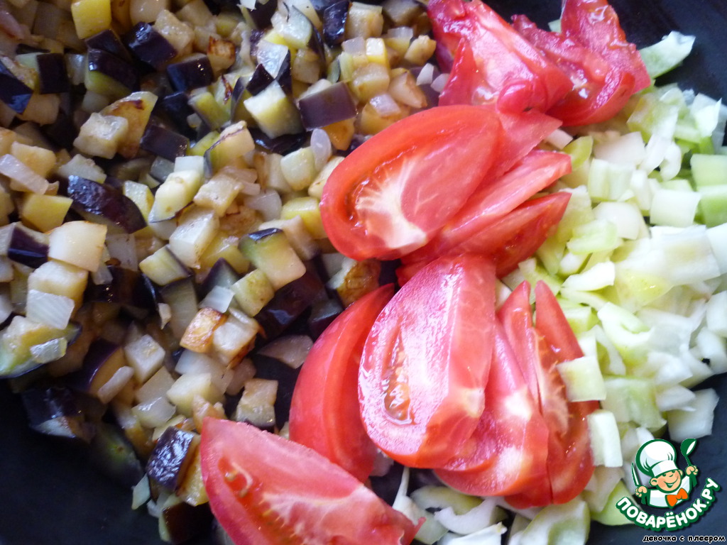 В сковороде разогреваем сливочное масло и обжариваем в нем в течение 15 минут, периодически помешивая, картофель, лук и баклажаны.