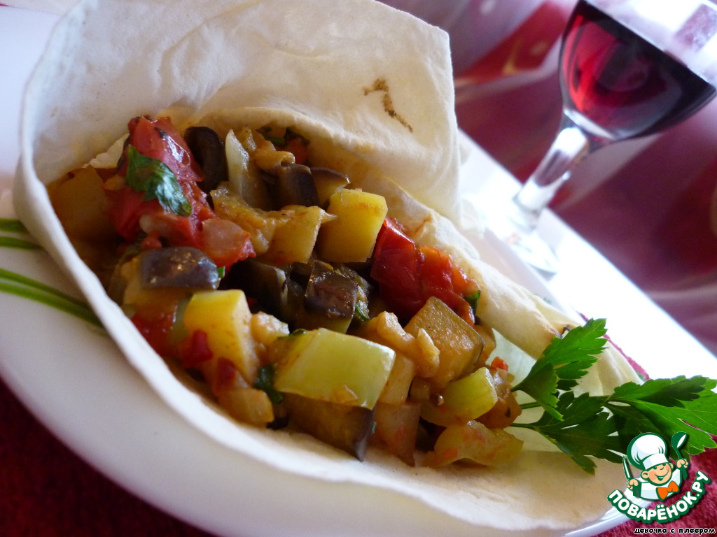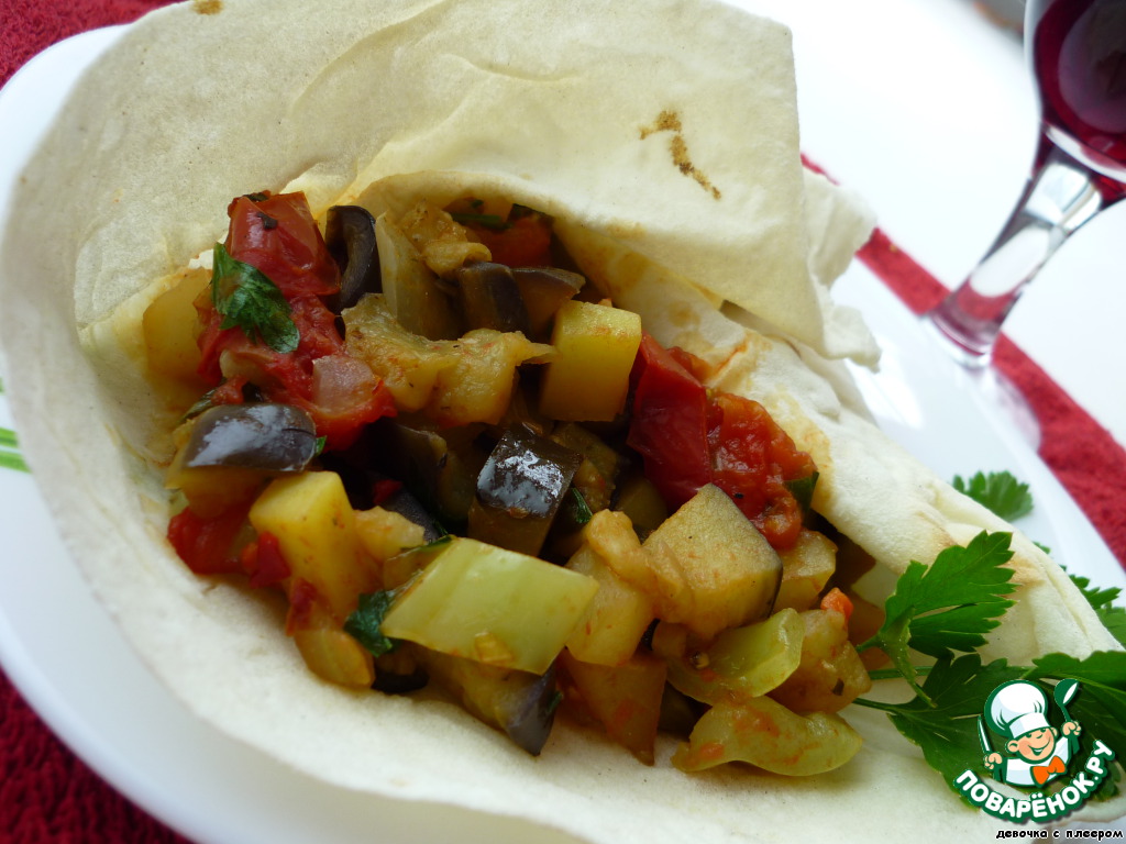 Свернуть лаваш кулечком, заполнить овощной смесью и украсить зеленью петрушки!
