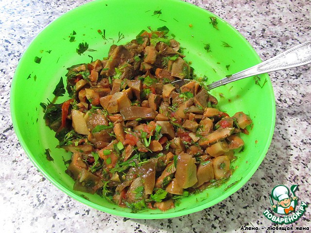 Грибы смешать с нарезанными помидорами и мелко нарубленной зеленью, это будет наша первая начинка