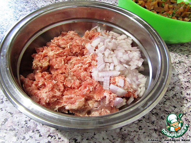 Для начала приготовим начинки, их будет две. Грибы, если свежие, отварить и нарезать, если соленые или маринованные, промыть их водой и нарезать, у меня же третий вариант - отваренные, нарезанные и замороженные, я их просто размораживаю и отжимаю лишнюю влагу.
