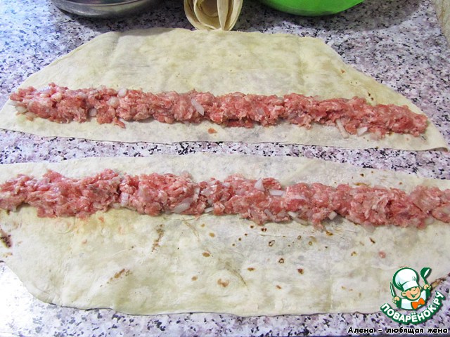 Лист лаваша разрезать вдоль на две половины, на края выложить фарш (не весь, поменьше половины)