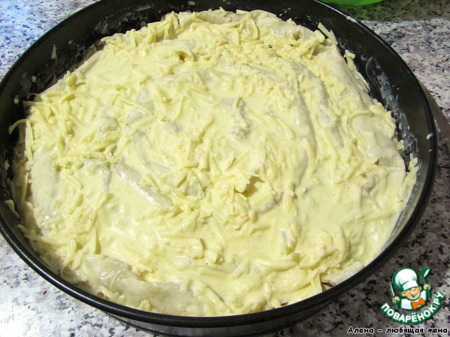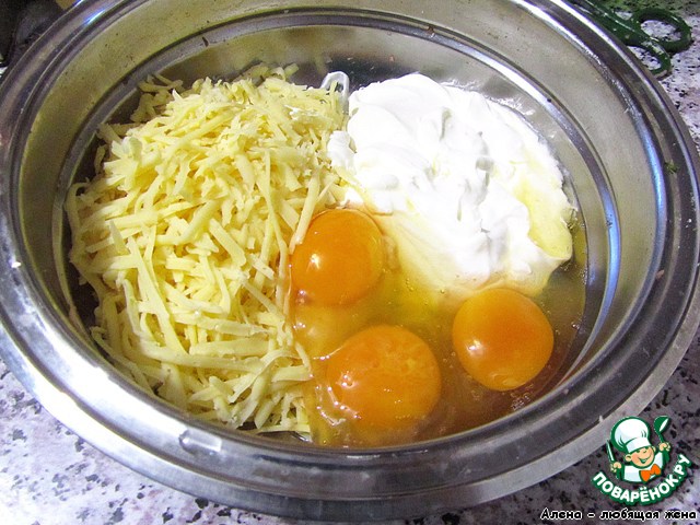 Готовим заливку: смешиваем сметану, яйца и сыр, натертый на крупной терке