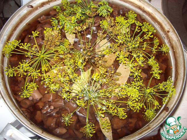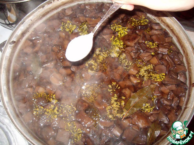 Для кипячения в третий раз на литр воды добавить 1 ст. ложку соли. Также добавить в грибы: лавровый лист - 6-7 штук на 3-4 литра уваренных грибов; перец горошком душистый, 6-8 шт. на 3-4 литра уваренных грибов; зонтики укропа - 6-8 шт. на 3-4 литра уваренных грибов; гвоздика - 6-7 шт. на 3-4 литра грибов.