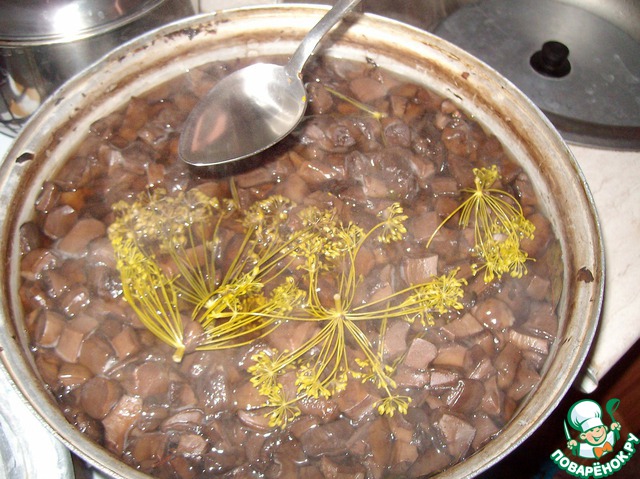 Залить водой так, чтобы вода полностью покрыла грибы. Кипятить. ОБЯЗАТЕЛЬНО снимать пену сразу после ее появления. После того, как грибы закипят, варить 10 минут. Затем слить воду, а грибы тщательно промыть.